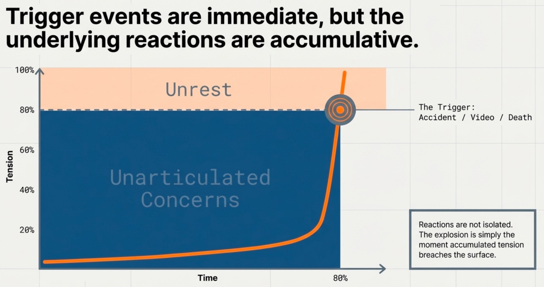 Each incident had a clear starting point. Yet the intensity of the response suggests that these were not isolated reactions, but expressions of accumulated concerns, some voiced, others perhaps unarticulated.